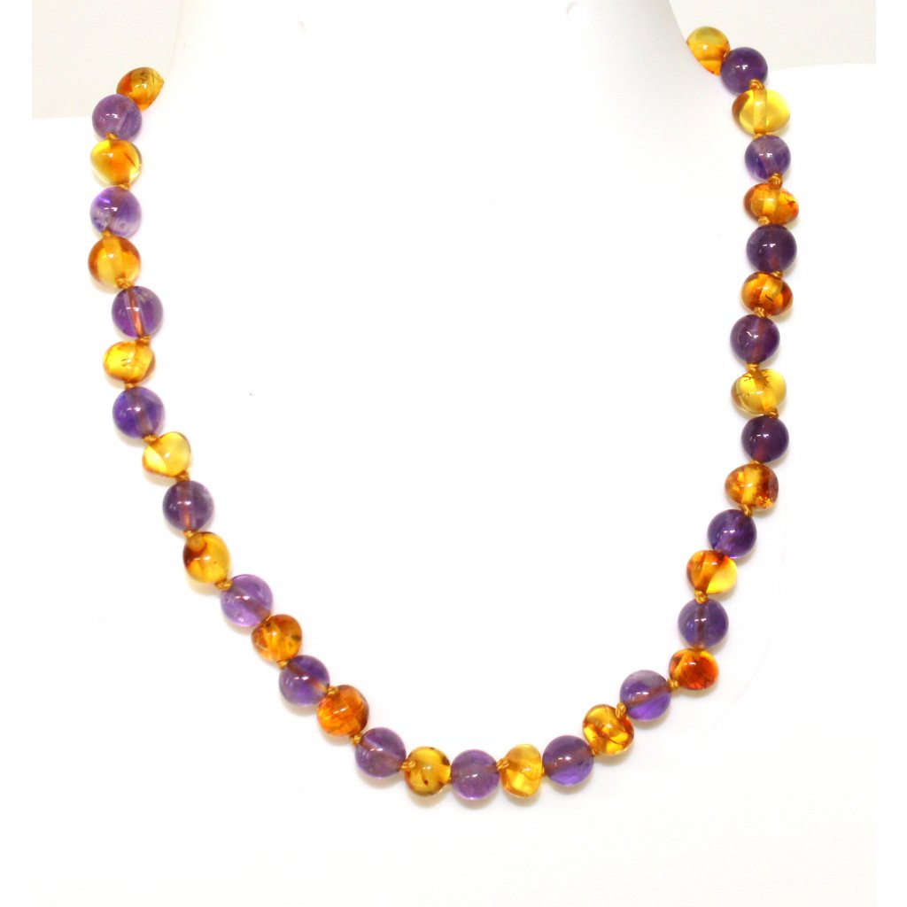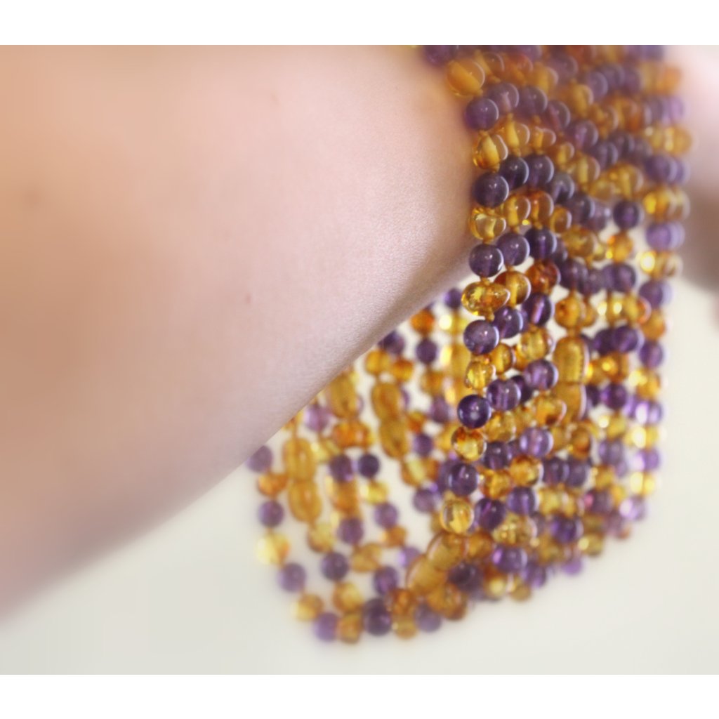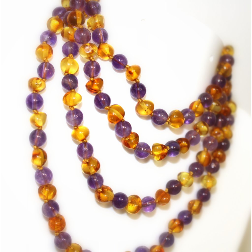 Jantarové korálky kulaté pro děti - medový jantar a světlý ametyst
