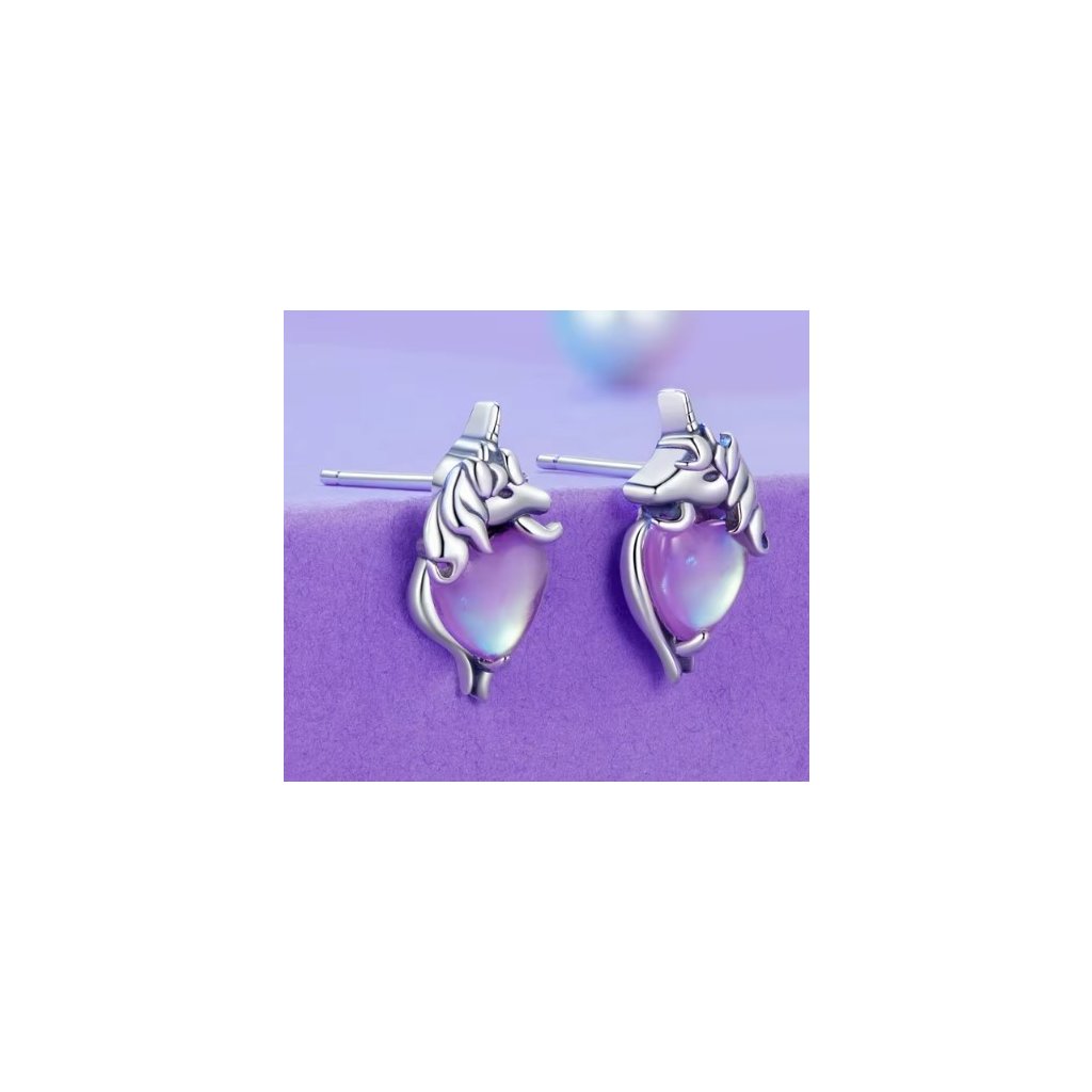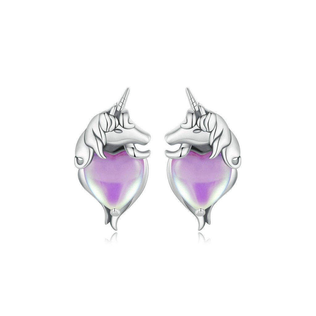 Stříbrné náušnice jednorožci s fialovým srdíčkem
